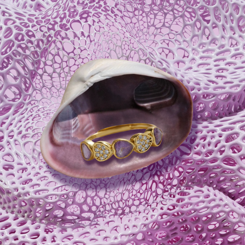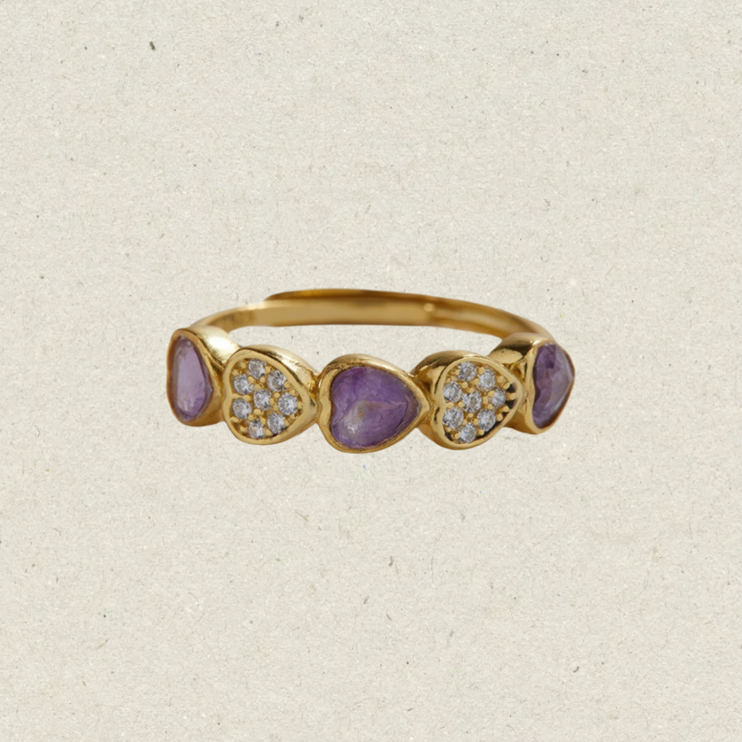 This is a heart-shaped gemstone ring available in two finishes: gold and silver. The design alternates between faceted purple amethyst gemstones and heart-shaped clusters of sparkling white crystals, symbolizing love and affection.