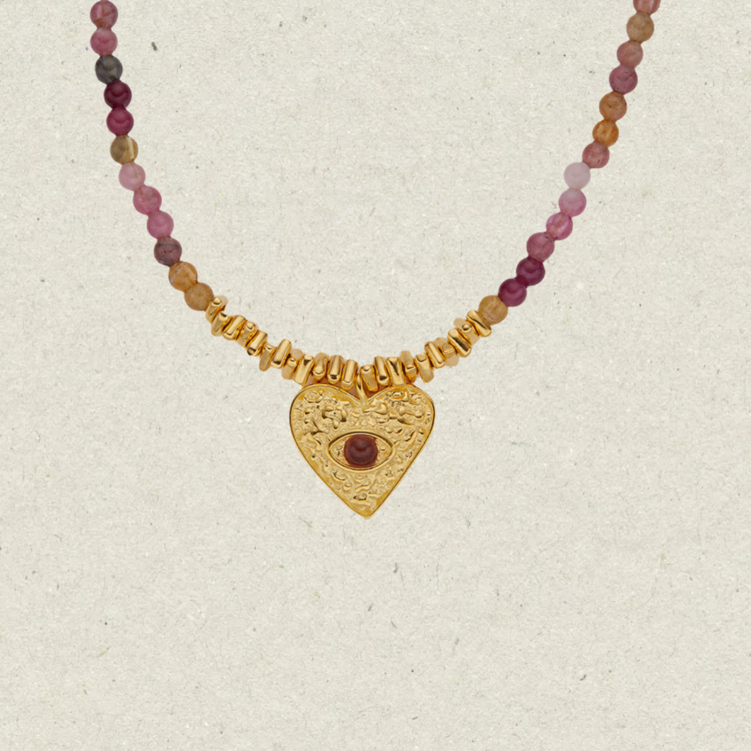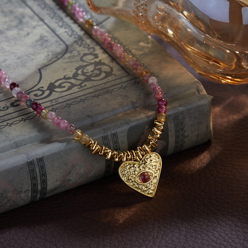 The necklace features a strand of beads, given the range of colors from deep purple to light pink. The centerpiece of the necklace is a heart-shaped pendant with a textured gold finish. Within the heart pendant, there is a smaller, round charm symbolizing passion and vitality.