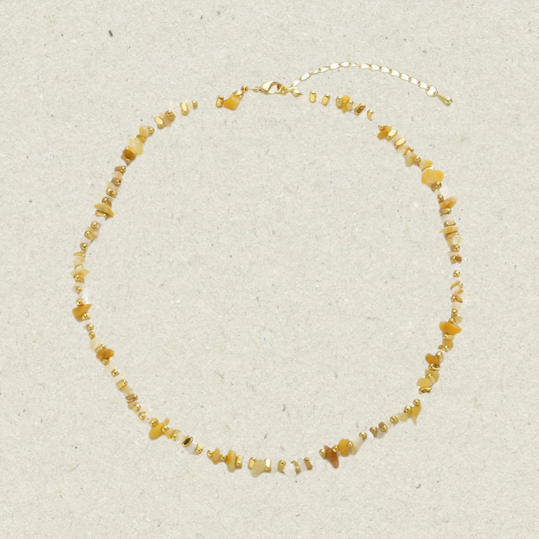 This necklace features irregular desert-yellow beads with polished gold elements, which vary in shape and sizes evoking the warm, golden tones of sunlit sands.