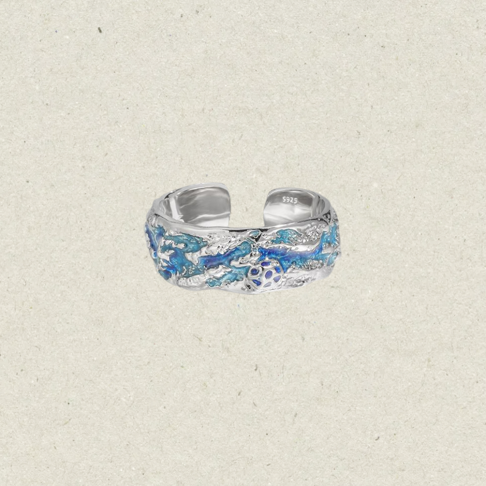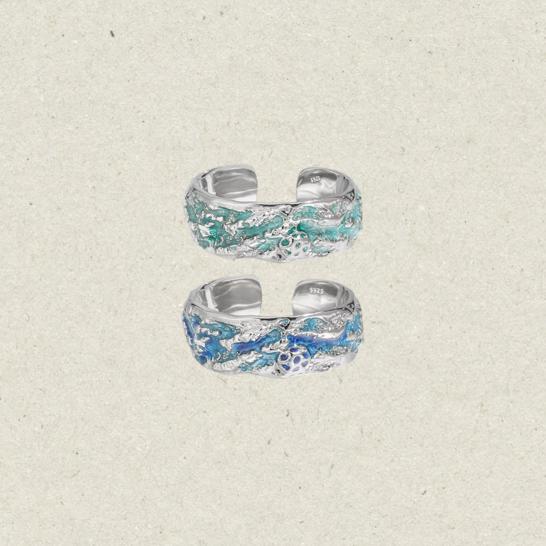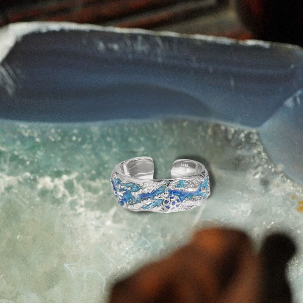 Crafted from 925 sterling silver, the band is accented with a blend of vibrant blue and green enamel, evoking the dynamic beauty of water and earth.