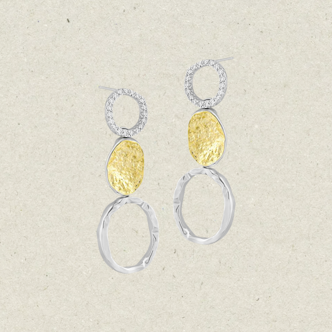 The earrings have a three-part design, with the top part being a small, white gold loop encrusted with white gemstones. The middle part is in a gold tone, and the bottom part is a larger, white gold loop.