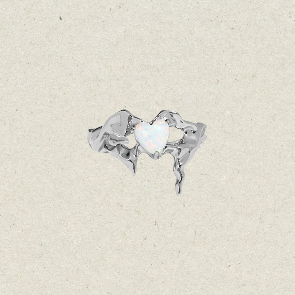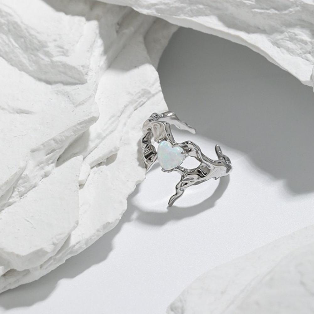 The ring is crafted from a silver-toned metal. At the heart of the ring is a synthetic opal, known for its iridescent qualities. The opal is set within an irregular, fluid-like metal frame that seems to mimic the natural flow of molten metal or the organic shapes found in nature.