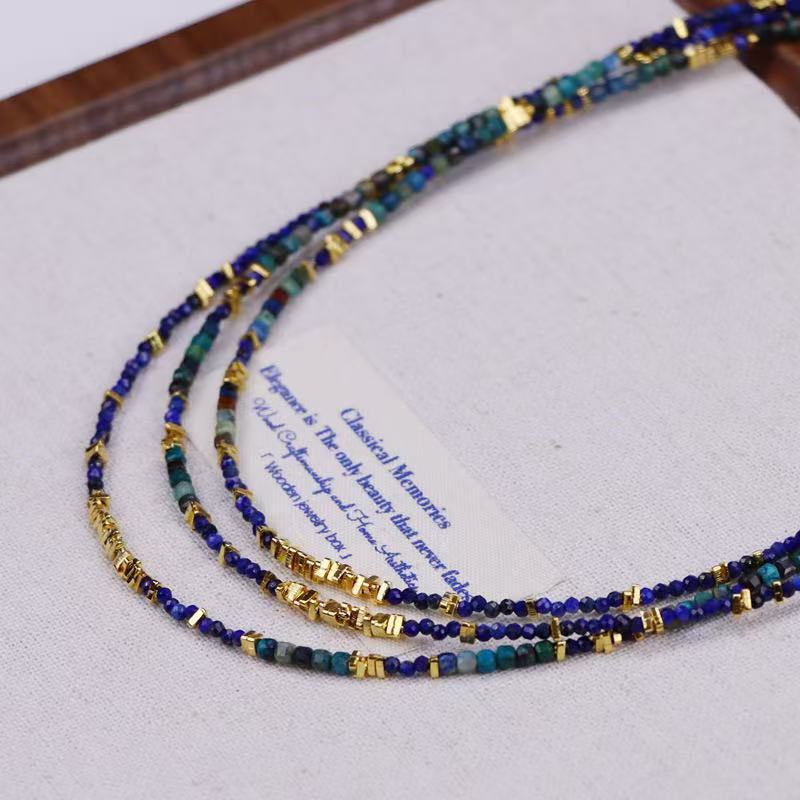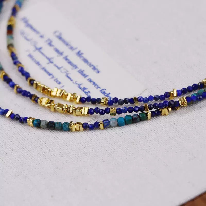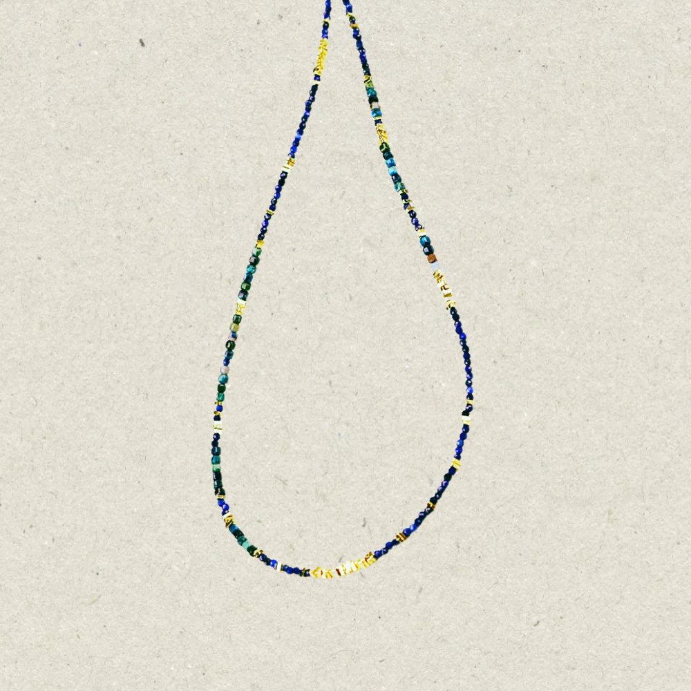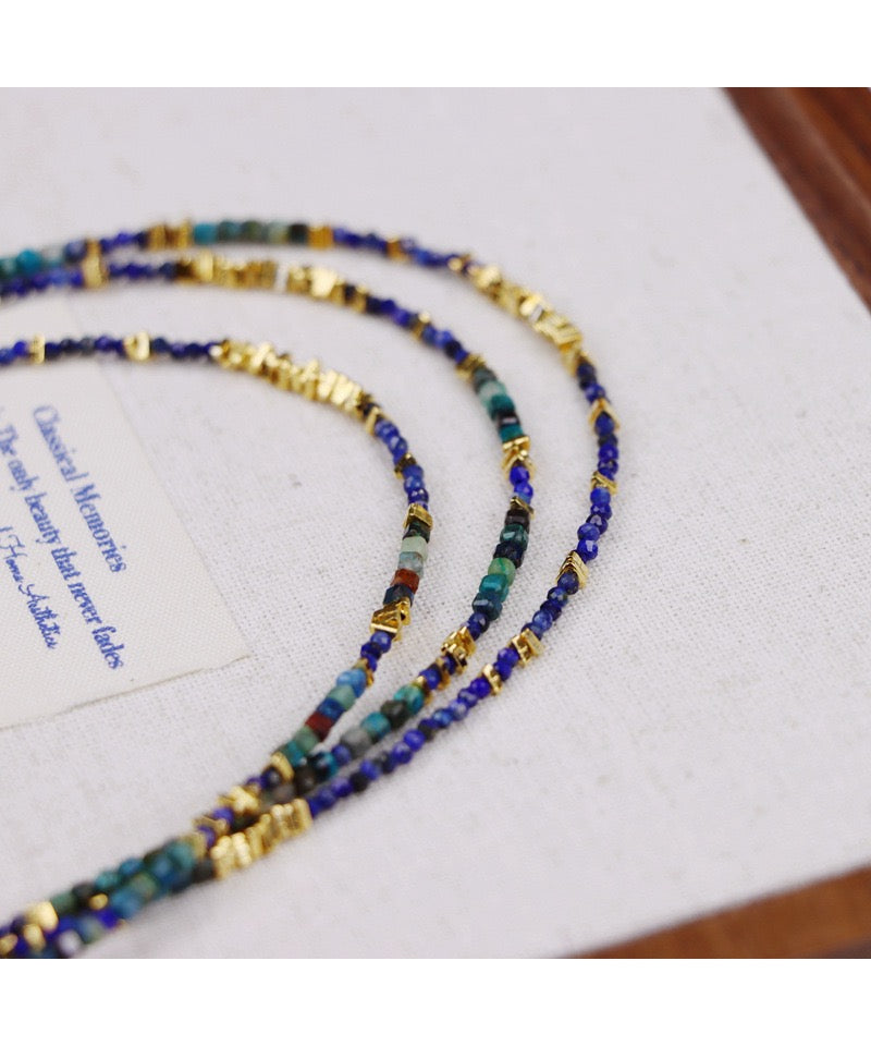 This necklace features a multi-strand design that intertwines deep blues and greens with subtle accents of gold.