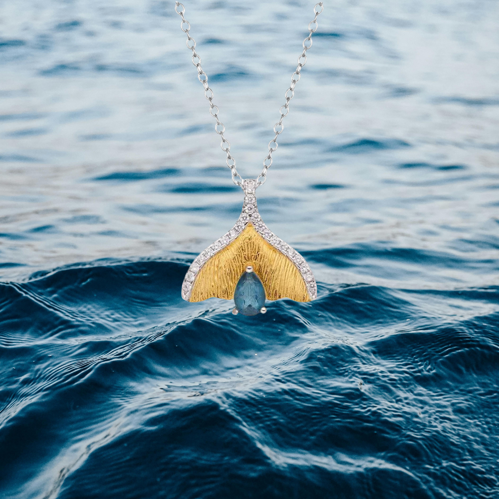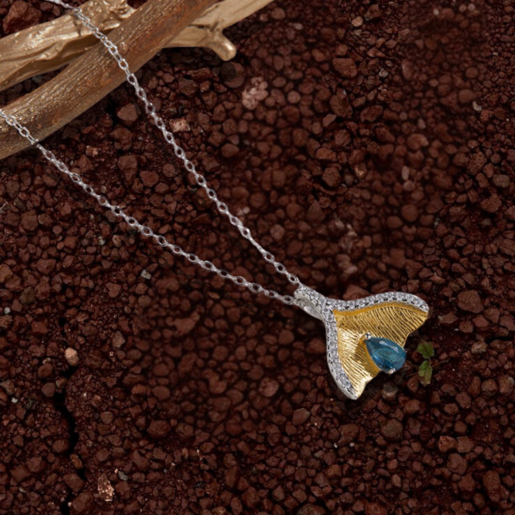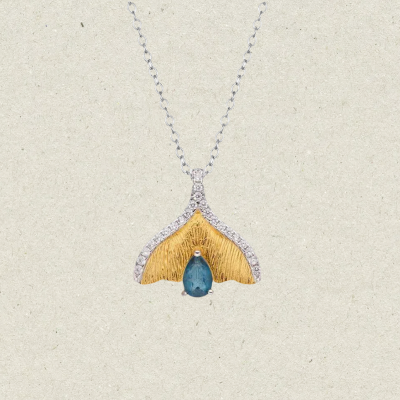 The necklace features a combination of gold and silver. The pendant has a distinctive shape that resembles a mermaid tail.The central blue topaz is surrounded by smaller clear gemstones.