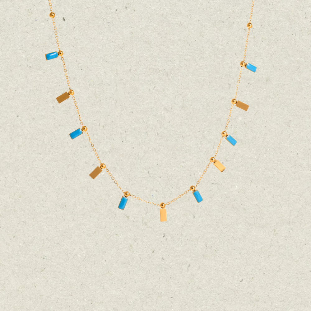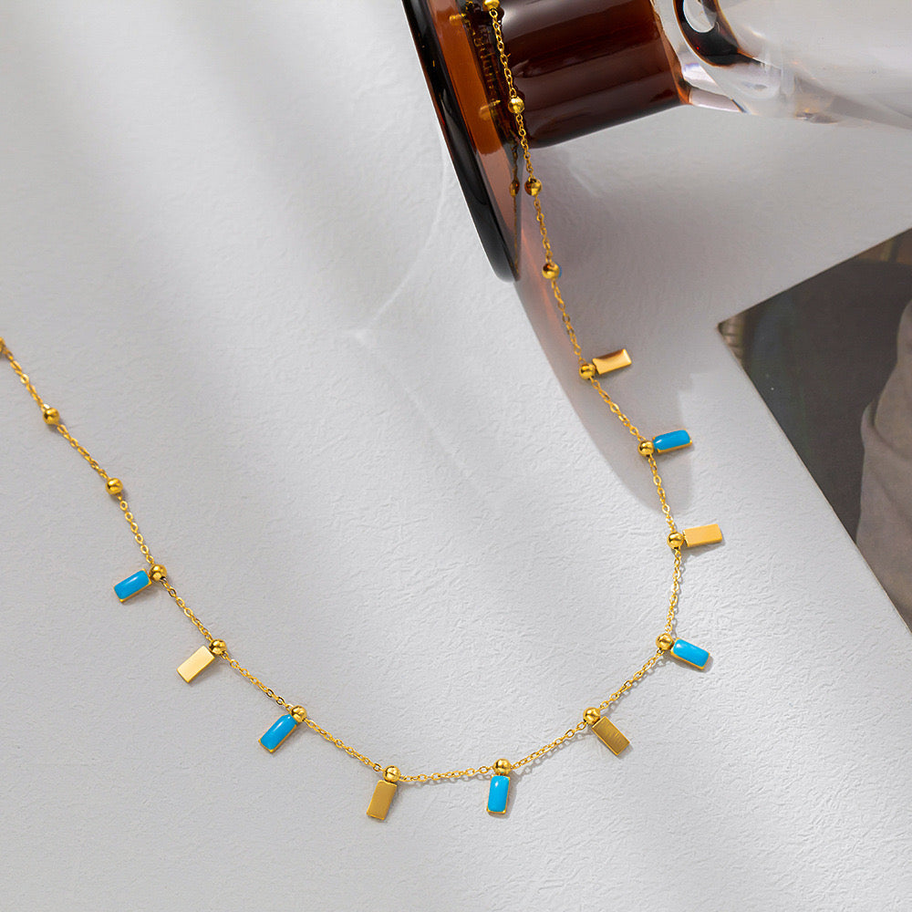 The necklace is crafted from gold-toned metal. It features rectangular turquoise-colored stones. The stones are spaced evenly along a delicate chain, with small gold beads separating each stone. This design creates a rhythmic pattern that is both eye-catching and sophisticated.