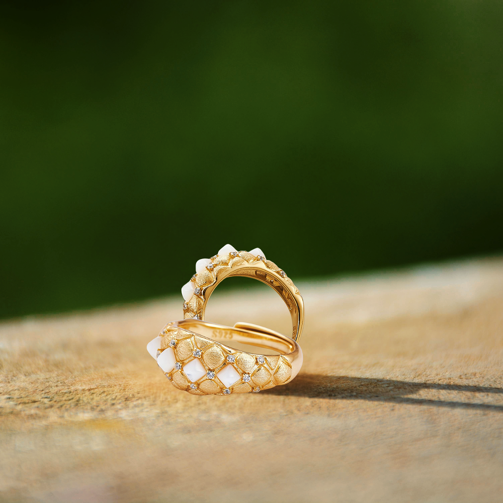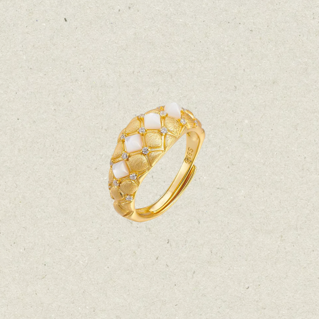 The surface of the ring has a textured pattern that resembles scale design, adding a tactile dimension to the piece. It is adorned with shell inlays, which are set within the textured pattern, enhancing the organic feel of the design.Small, clear zircon, are set at the points where the textured segments meet.