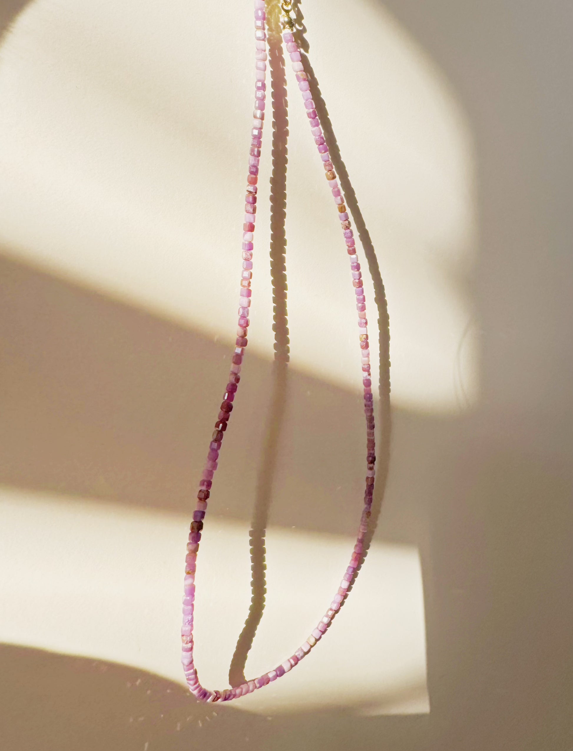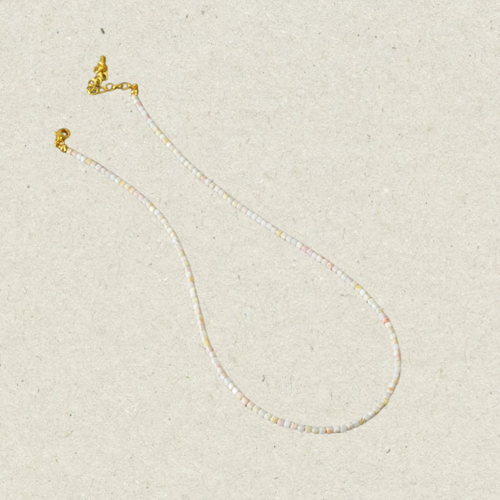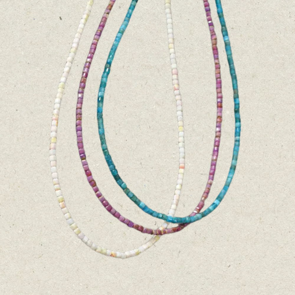 The necklace is composed of small, cylindrical beads that are made of natural stones. The beads display a spectrum of colors, including phosphor gray, purple mica and shell white.