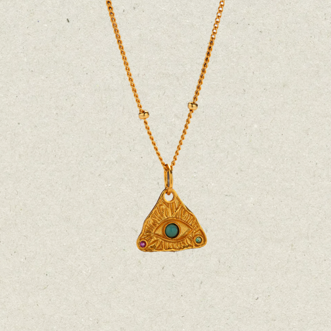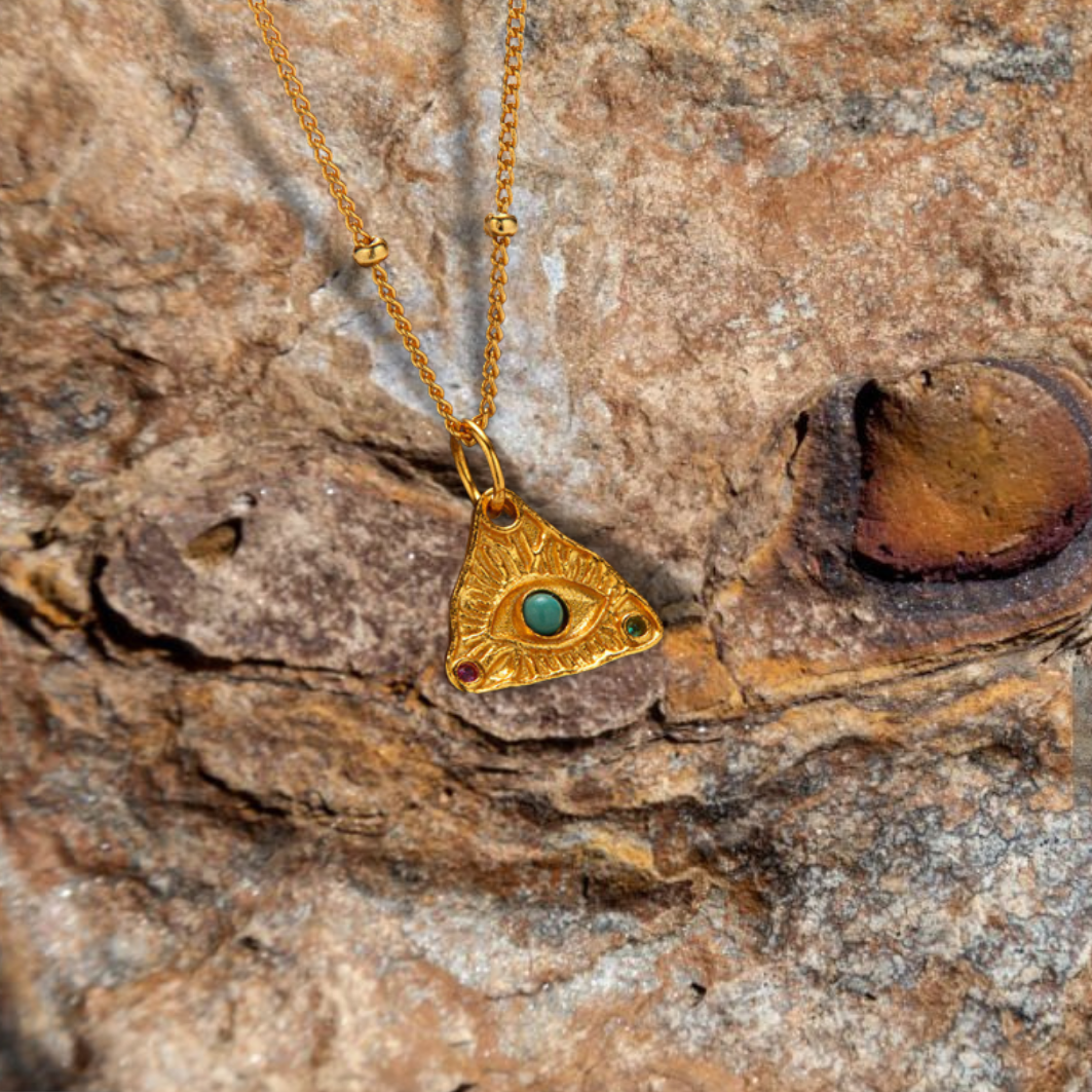 The pendant is triangular, a shape that can be associated with stability and strength. The central feature of the pendant is the eye. The eye is adorned with a central turquoise stone, flanked by smaller pink and green stones. These colors can represent a variety of concepts, from health and tranquility (turquoise) to love and compassion (pink), and growth or harmony (green).