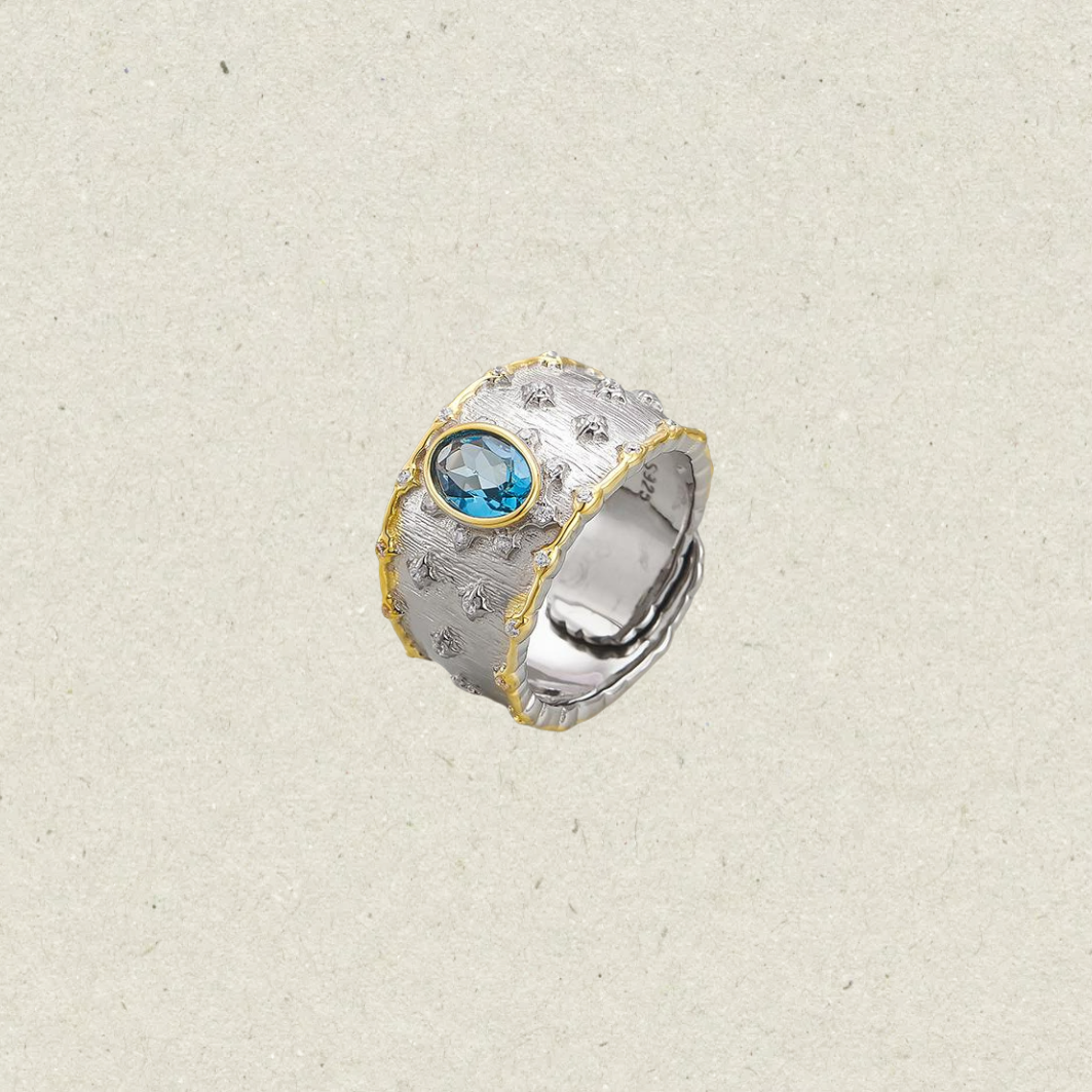 This is a uniquely designed ring featuring a bold, textured band with a combination of silver and gold tones. The band showcases an organic, handcrafted look with small raised details resembling natural textures. The central element is a vivid blue gemstone, cut in a faceted oval shape.