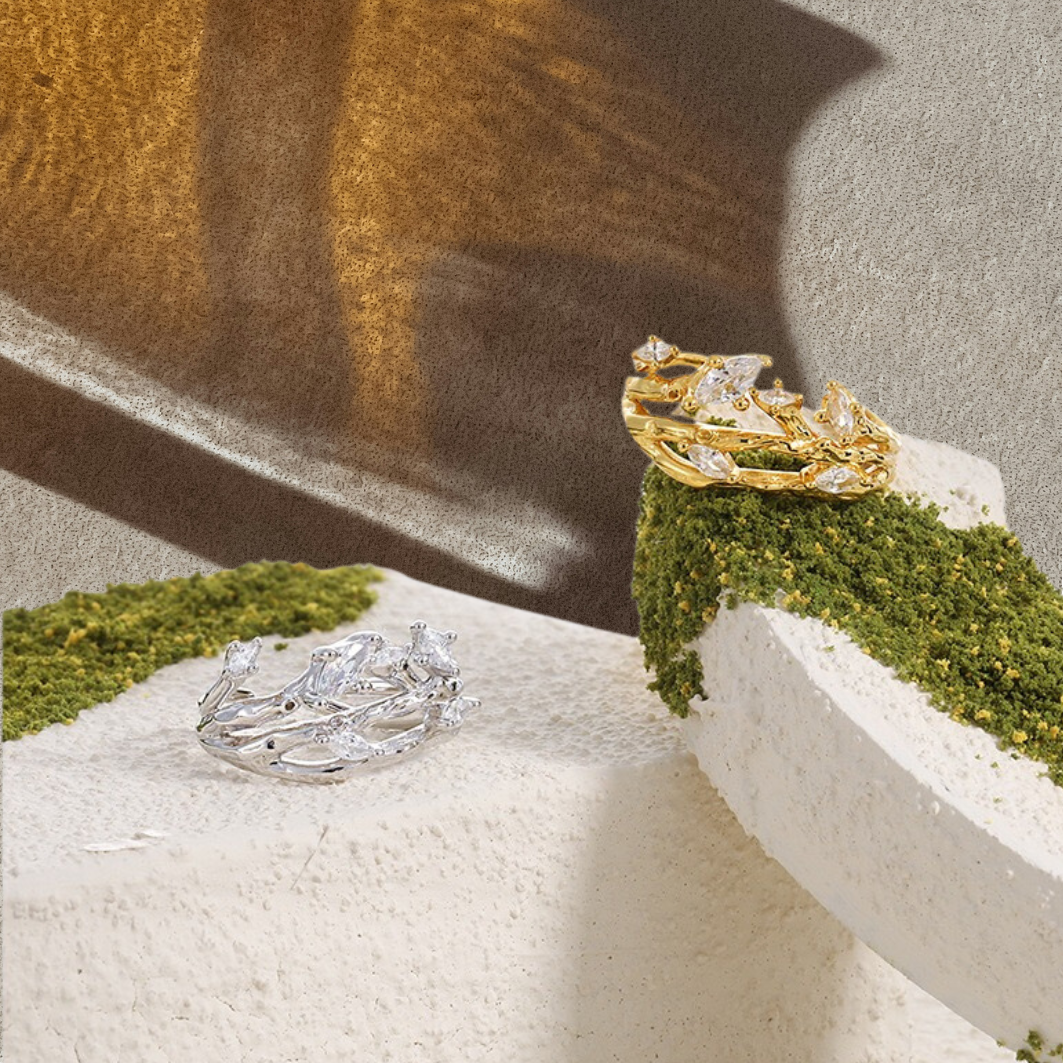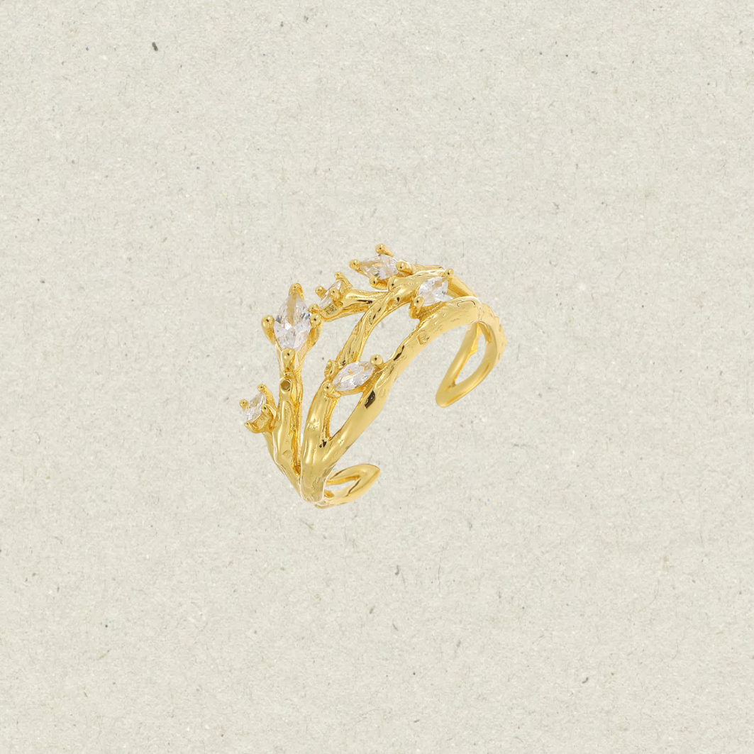 This ring features a delicate, nature-inspired design crafted in gold/silver. The band is intricately shaped to resemble intertwined branches, creating a natural and organic aesthetic. Small, marquise-cut gemstones are strategically placed along the "branches," mimicking the appearance of budding leaves or blossoms.