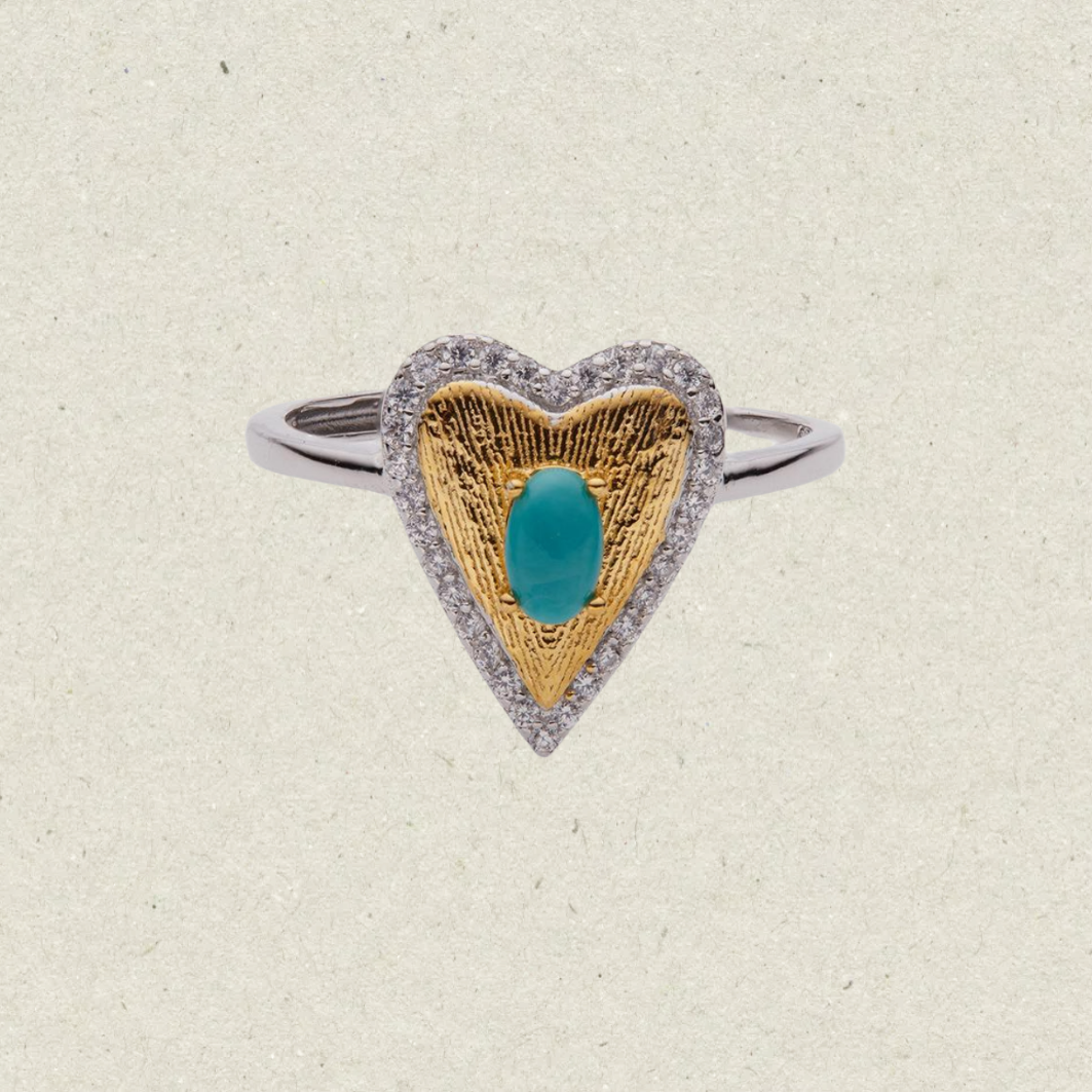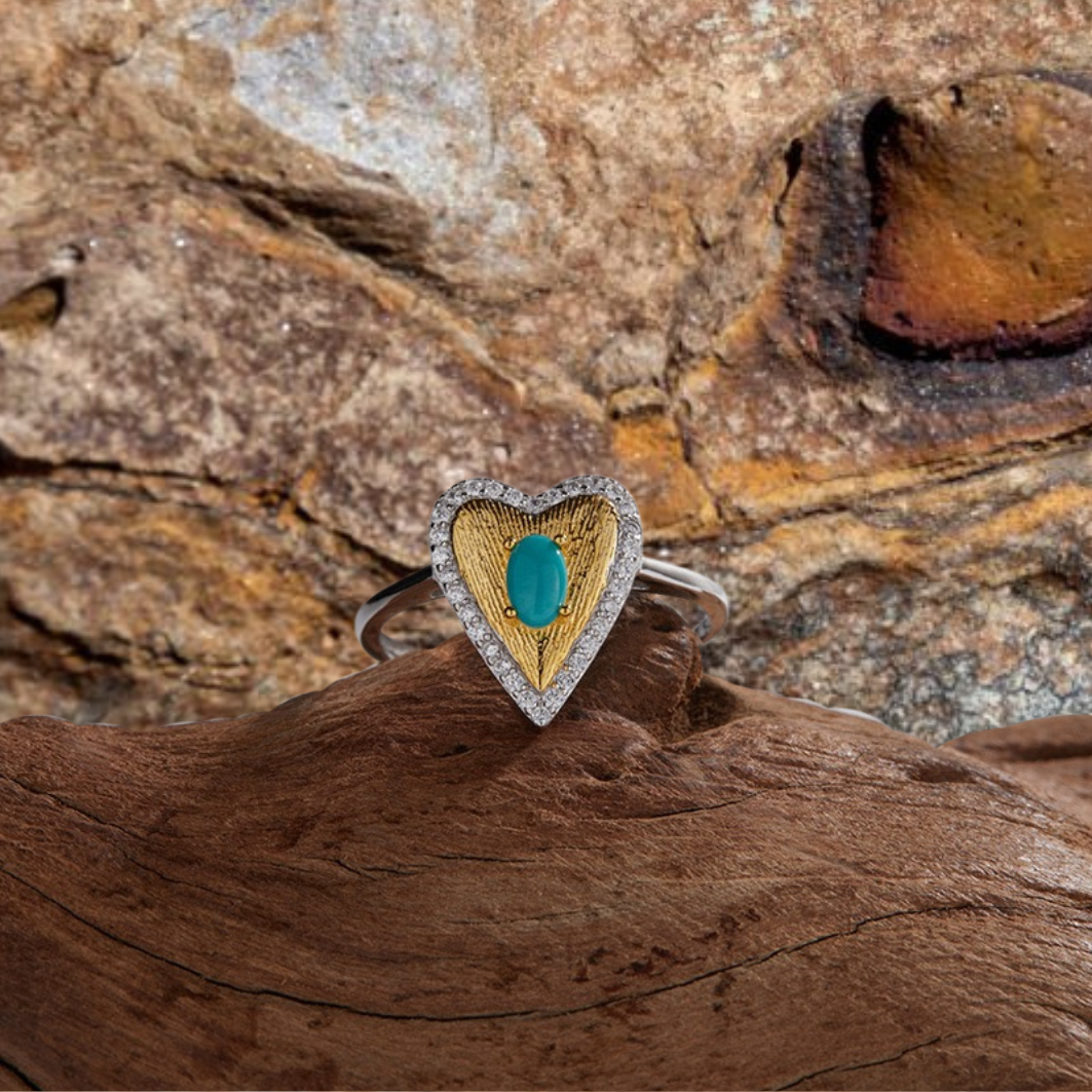 This ring features a unique heart-shaped design with a harmonious blend of precious metals and gemstones. The outer layer is encrusted with shimmering white stones, forming a dazzling border. At the center, a vibrant turquoise gemstone is set against a textured gold-toned background.