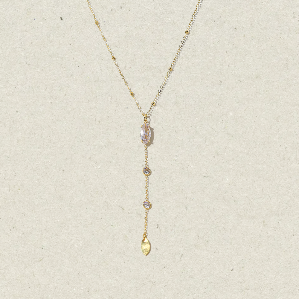 The necklace has a lariat style, with a chain that drapes gracefully around the neck and a pendant that hangs centrally. The pendant consists of a larger zircon at the top, followed by a series of smaller zircon leading to a teardrop-shaped gem at the bottom.